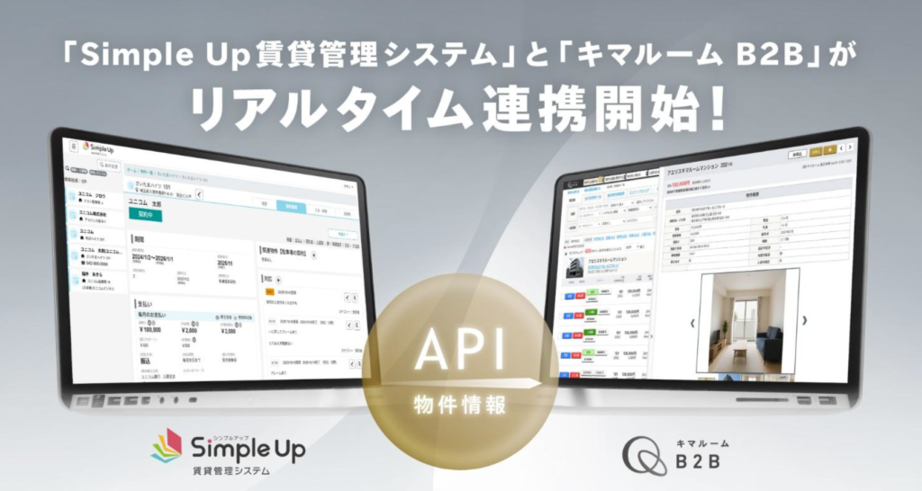 ユニコム株式会社(本社:埼玉県入間市、代表取締役:町田 達彦、以下「ユニコム」)が不動産管理会社向けに提供している「Simple Up賃貸管理システム」と、株式会社キマルーム(本社:東京都千代田区、代表取締役社長:藤井 志郎、以下「キマルーム」)が提供する業者間流通サービス「キマルーム B2B」が2025年12月よりリアルタイム連携を開始します。